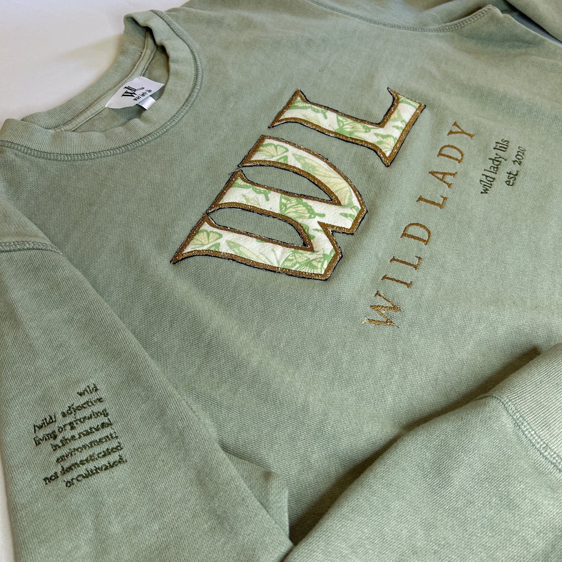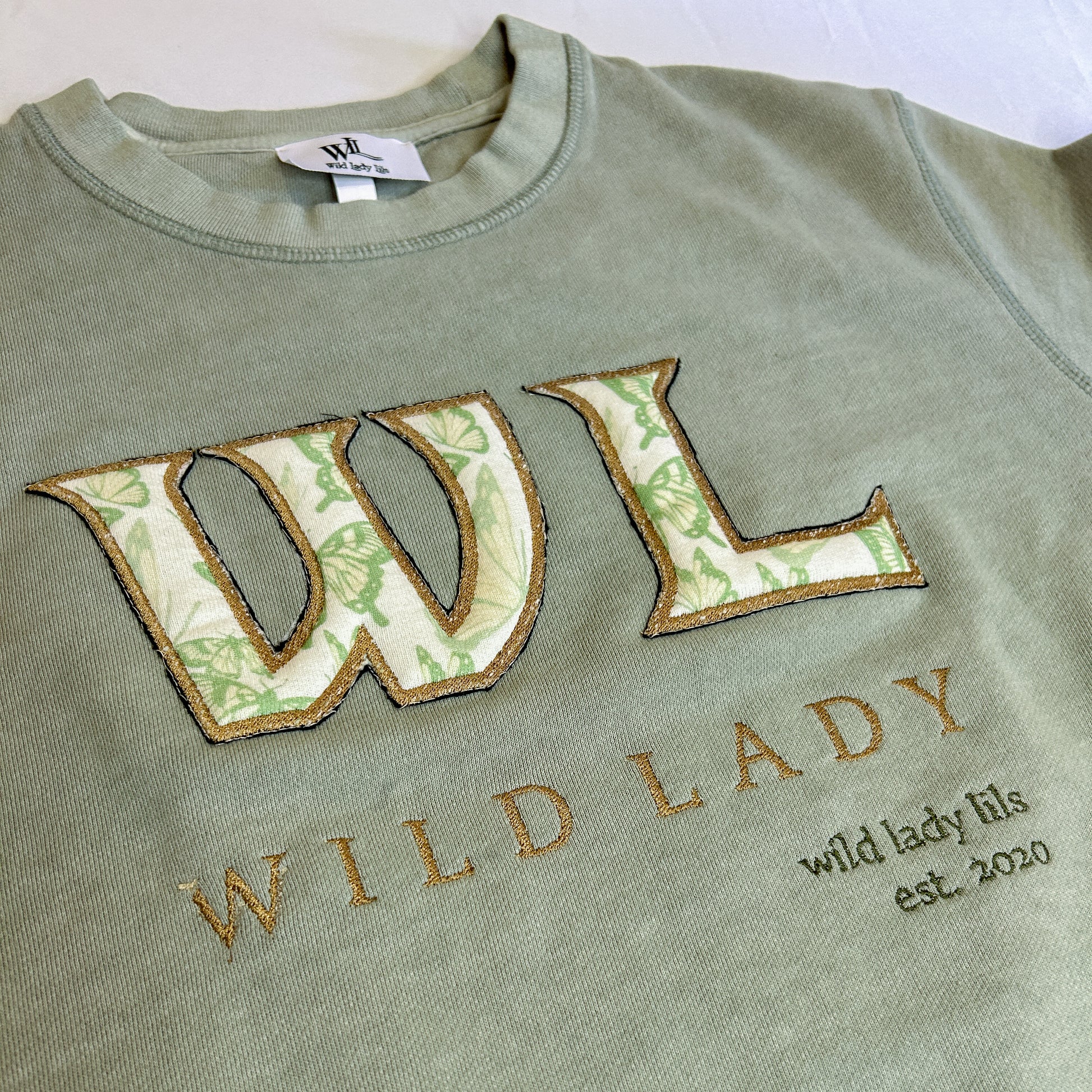 This classic unisex sweatshirt is 100% organic cotton. It is so soft to the touch it will be your favorite piece to put on day or night. The puff embroidery detail utilizes the butterfly tattoo print making and the sage color makes it the perfect piece to throw over the Long Sleeve Silky Jersey Maxi Dress in Folklore Print The right sleeve features embroidery with the definition of wild: living or growing in the natural environment; not domesticated or cultivated.