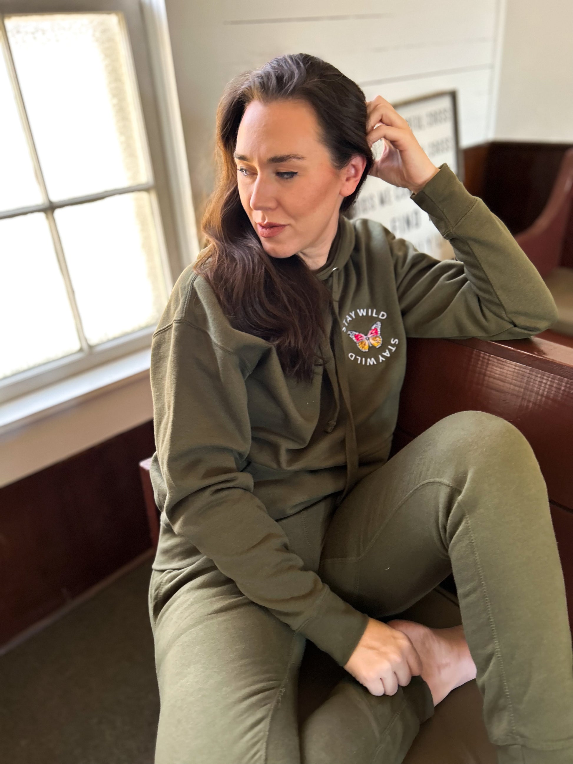 These unisex fleece sweatpants are super cozy and warm this winter. Stay warm in style by pairing them with the matching Stay Wild Hoodie in Olive, or pair them with a jean jacket and combat boots for the rare occasion that you need to leave the house. 3 super convenient pockets make these jogger/sweatpants even better. The left leg features embroidery translating Wild in 8 languages; Dutch, French, Korean, English, Spanish, Hindi, Italian, & Hebrew.