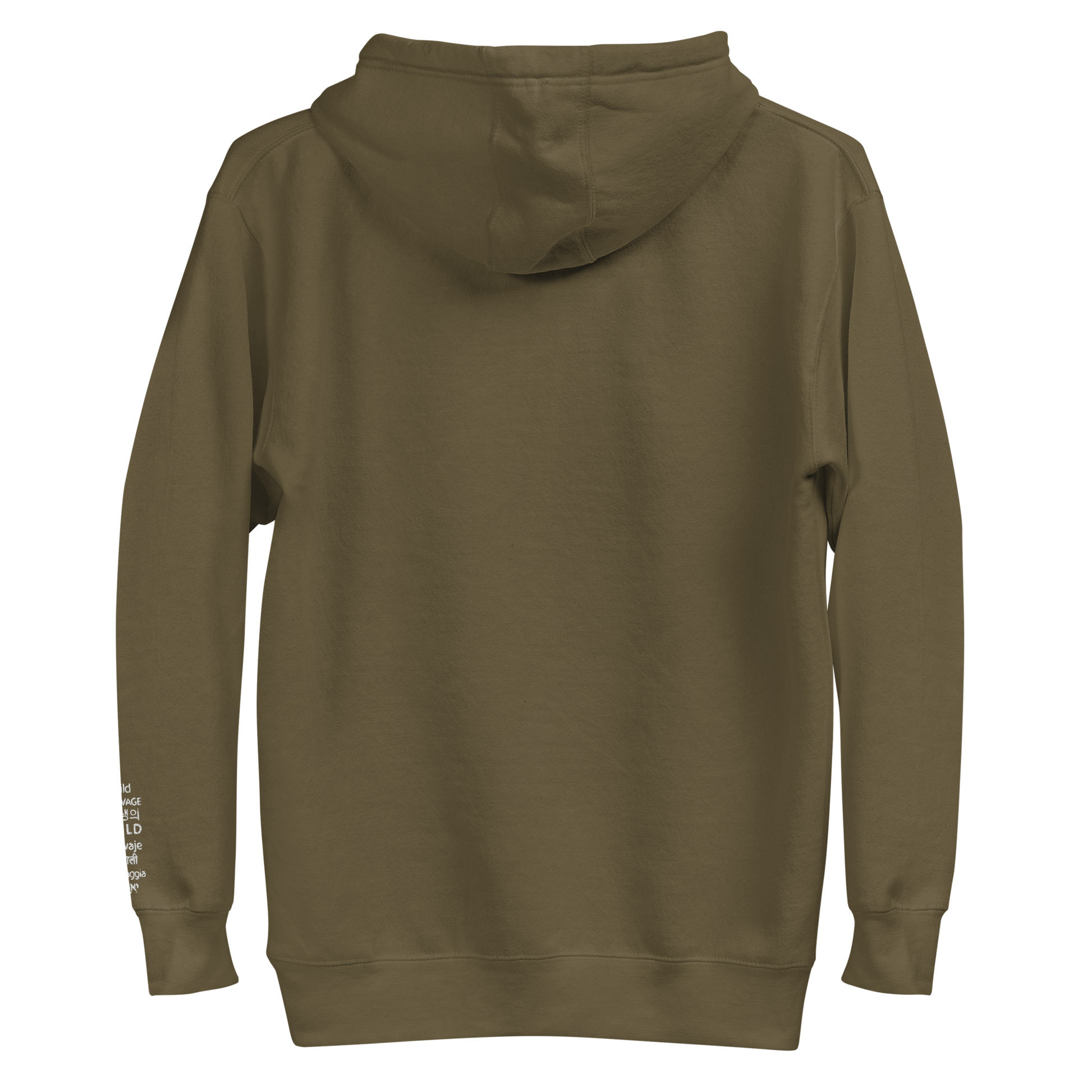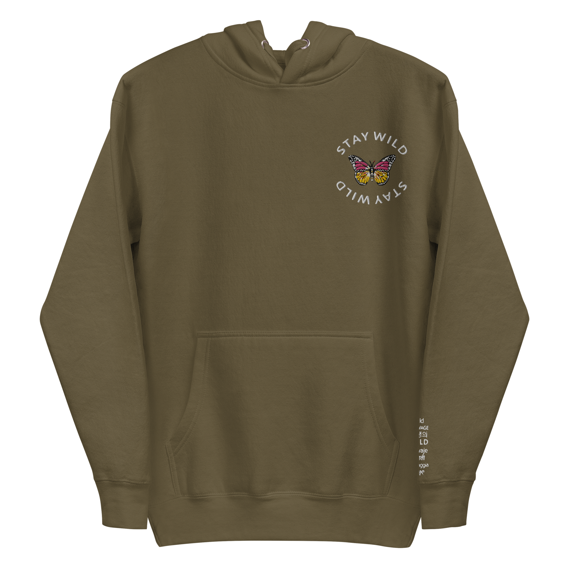 Classic unisex hoodie with a front pouch pocket and matching flat drawstrings. The 100% cotton exterior makes this hoodie soft to the touch and the fleece interior makes it cozy and warm for the cold winter ahead. Our Stay Wild Butterfly is embroidered and serves as a beautiful reminder to be true to yourself. The left sleeve features embroidery translating Wild in 8 languages; Dutch, French, Korean, English, Spanish, Hindi, Italian, & Hebrew.