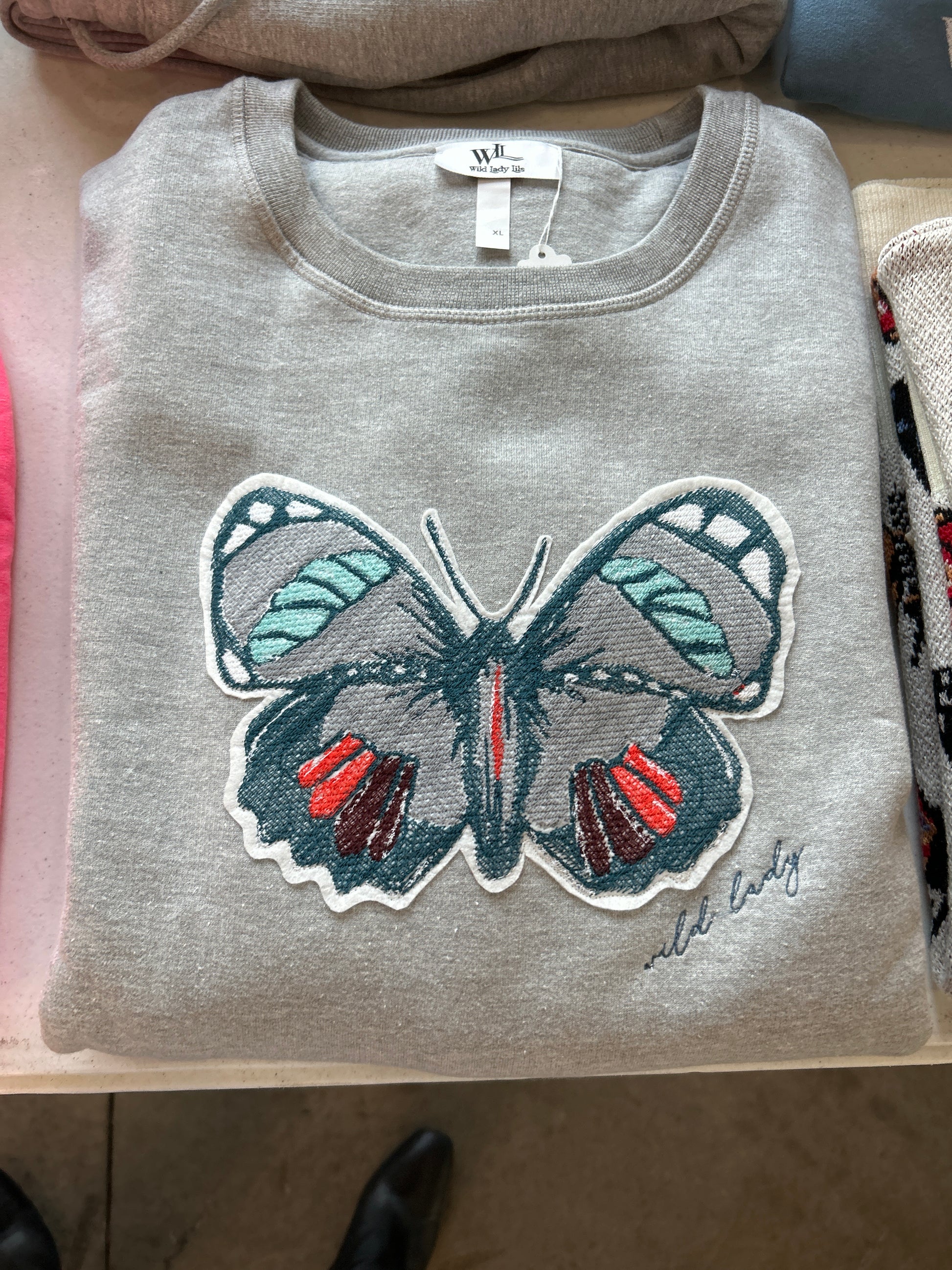 Who said neutrals have to be boring? This heather gray crewneck is proof that subtle can still steal the show. Featuring an embroidered butterfly that pops just enough, it’s the effortlessly cool staple your closet’s been waiting for.