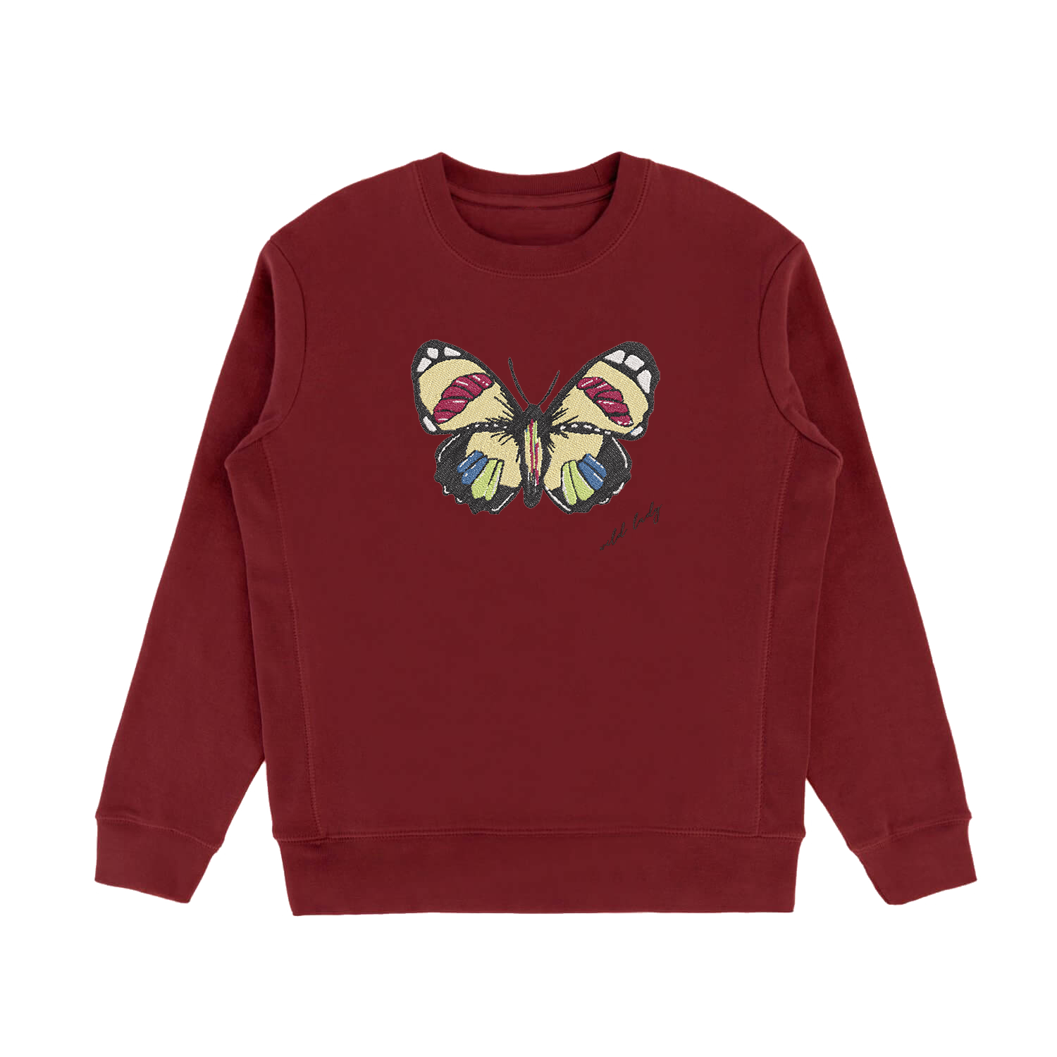 Moody, rich, and a little mysterious — this oxblood crewneck brings serious main-character energy without even trying. The embroidered butterfly adds a flash of contrast, like a wink from someone who knows they look good.