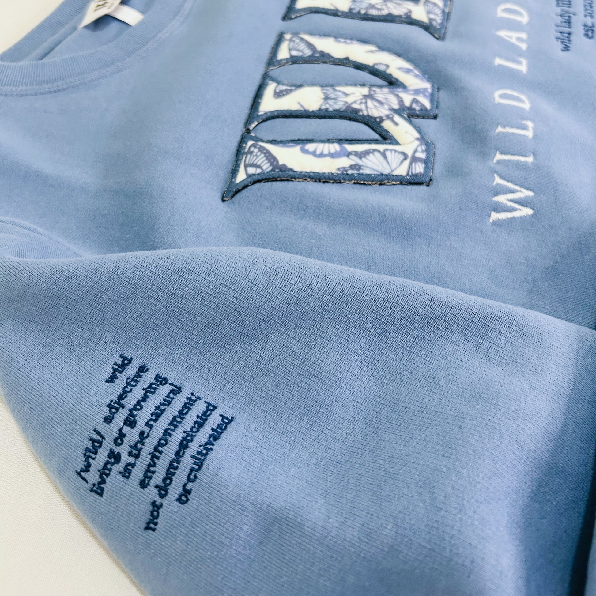 This classic unisex sweatshirt is 100% organic cotton. It is so soft to the touch it will be your favorite piece to put on day or night. The puff embroidery detail utilizes the butterfly tattoo print making this sweatshirt perfect to pair with the Midi Wrap Flounce Skirt in Butterfly Tattoo to go out, or pair it with the matching joggers to stay in! The right sleeve features embroidery with the definition of wild: living or growing in the natural environment; not domesticated or cultivated.