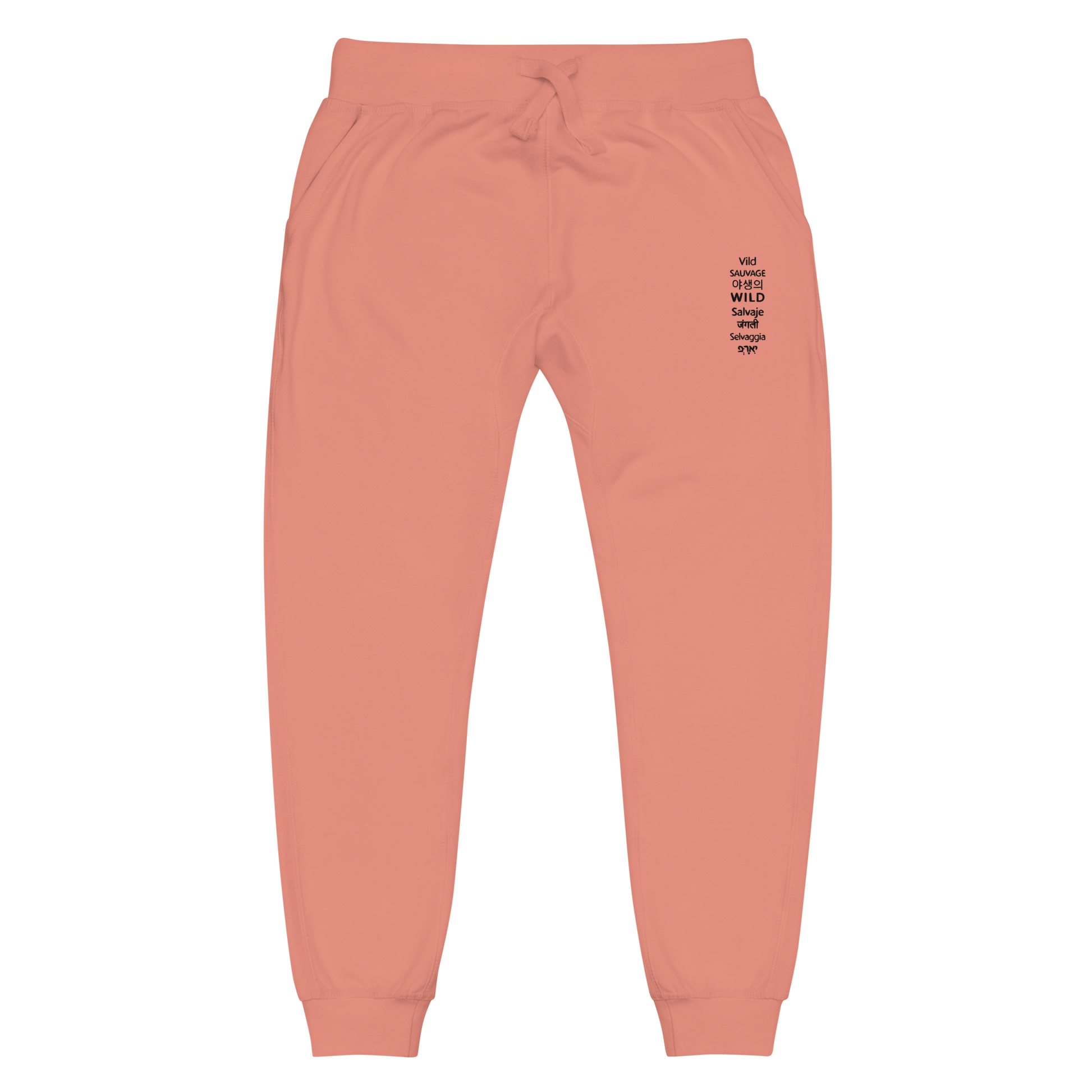 These unisex fleece sweatpants are super cozy and warm this winter. Stay warm in style by pairing them with the matching Stay Wild Hoodie in Dusty Rose, or pair them with a jean jacket and combat boots for the rare occasion that you need to leave the house. 3 super convenient pockets make these jogger/sweatpants even better. The left leg features embroidery translating Wild in 8 languages; Dutch, French, Korean, English, Spanish, Hindi, Italian, & Hebrew.